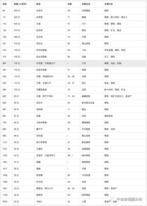 2020年10月20日,全球最大的財富榜排榜機構胡潤研究院聯合發布《2020衡昌燒坊·胡潤百富榜》,這是胡潤研究院自1999年以來連續第22次發布“胡潤百富榜”。今年有30位鋼鐵行業的企業家入圍榜單,日照鋼鐵杜雙華以500億財富成為鋼鐵行業首富。