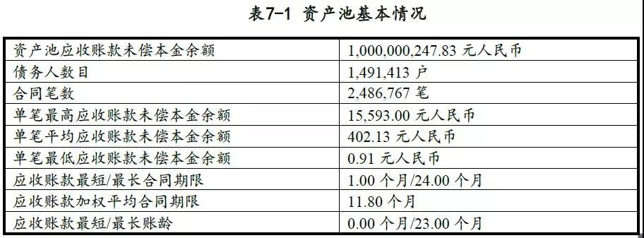 模擬資產池應收賬款未償本金余額為100,000.02萬元,筆數為2,486,767筆,用戶數量為1,491,413戶,單筆借款最大未償本金余額為15,593.00元,最小未償本金余額為0.91元,平均為402.13元。