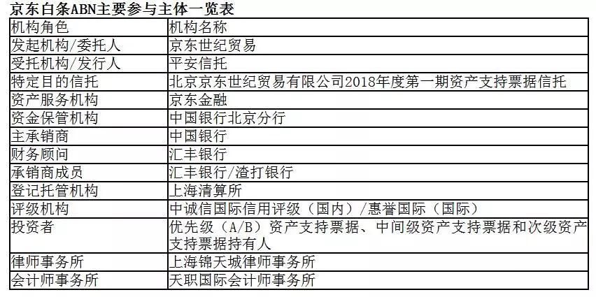本次交易基礎資產為京東世紀貿易將其持有的京東白條應收賬款資產信托給平安信托,設立“北京京東世紀貿易有限公司2018年度第一期資產支持票據信托”。平安信托以該信托財產為基礎發行固定利率的4檔產品。