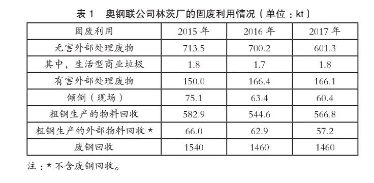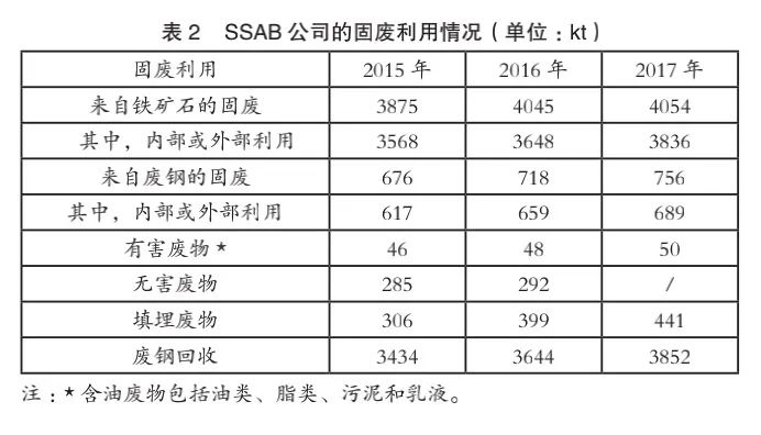 SSAB 公司在瑞典、芬蘭和美國都設有鋼鐵廠,2017年的粗鋼總產量為880 萬噸,其中美國鋼鐵廠通過廢鋼回收利用,實現粗鋼產量240 萬噸;在瑞典和芬蘭的分廠共有20%的粗鋼采用廢鋼生產。表2 總結了SSAB 公司的固廢利用情況。約95%的礦石煉鋼所產固廢和91%的廢鋼煉鋼所產固廢分別在內部和外部得到利用。