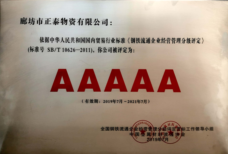 目前公司是SGS國際認證機構ISO9001:2015認證企業,為中國金屬材料流通協會理事單位、河北省金屬材料流通協會副會長單位、中國鋼結構協會會員、五阿哥授權品牌拍檔、河北省金屬材料流通協會創新發展企業、中國金屬材料流通協會企業信用評價AAA級企業、鋼鐵流通企業經營管理分級評定AAAAA級企業;中國金屬材料流通協會銷售五十強入圍企業、中國鋼鐵供應鏈信用建設示范企業、五阿哥電商拍檔50強、蘭格鋼鐵營銷50強、蘭格鋼鐵雄安新區建設推薦優質供應商、我的鋼鐵型材榜百強企業、我的鋼鐵雄安新區建設推薦鋼鐵供應商。